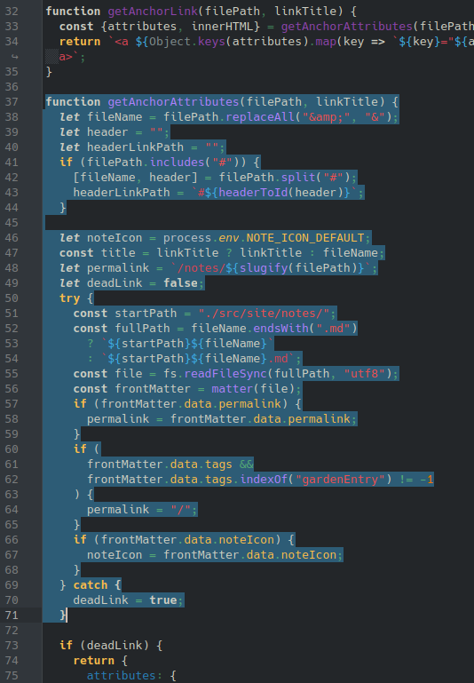 Replace the lines 37-71 in the eleventy.js (screenshotted above) at the root of your Digital Garden repo with the following code: