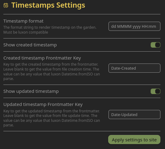 For example, if you added the following creation date 2025-05-28 23:59:58.024 to a file and you set the timestamp format in your plugin settings as HH:mm, MMMM dd yyyy, your page would show “23:59, May 28 2025” below the header.