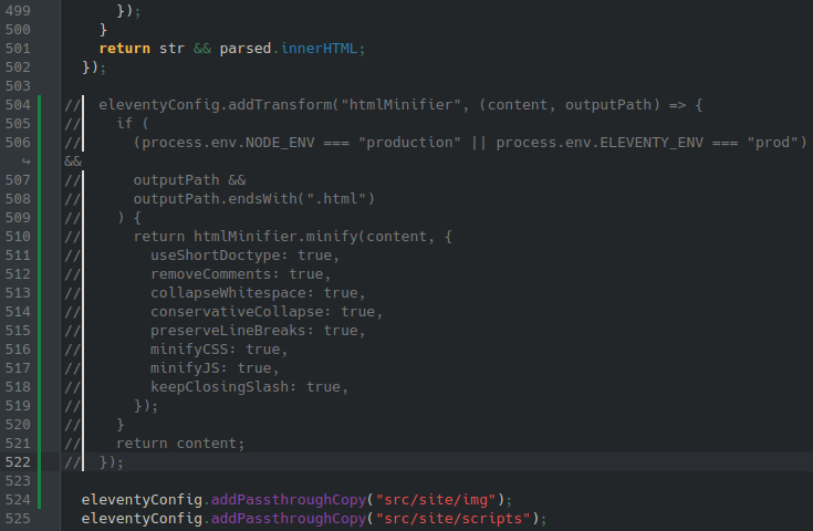 To remove htmlMinifier, open .eleventy.js in your favorite text or code editor, and add a // to the beginning of every line in the “htmlMinifier” section.