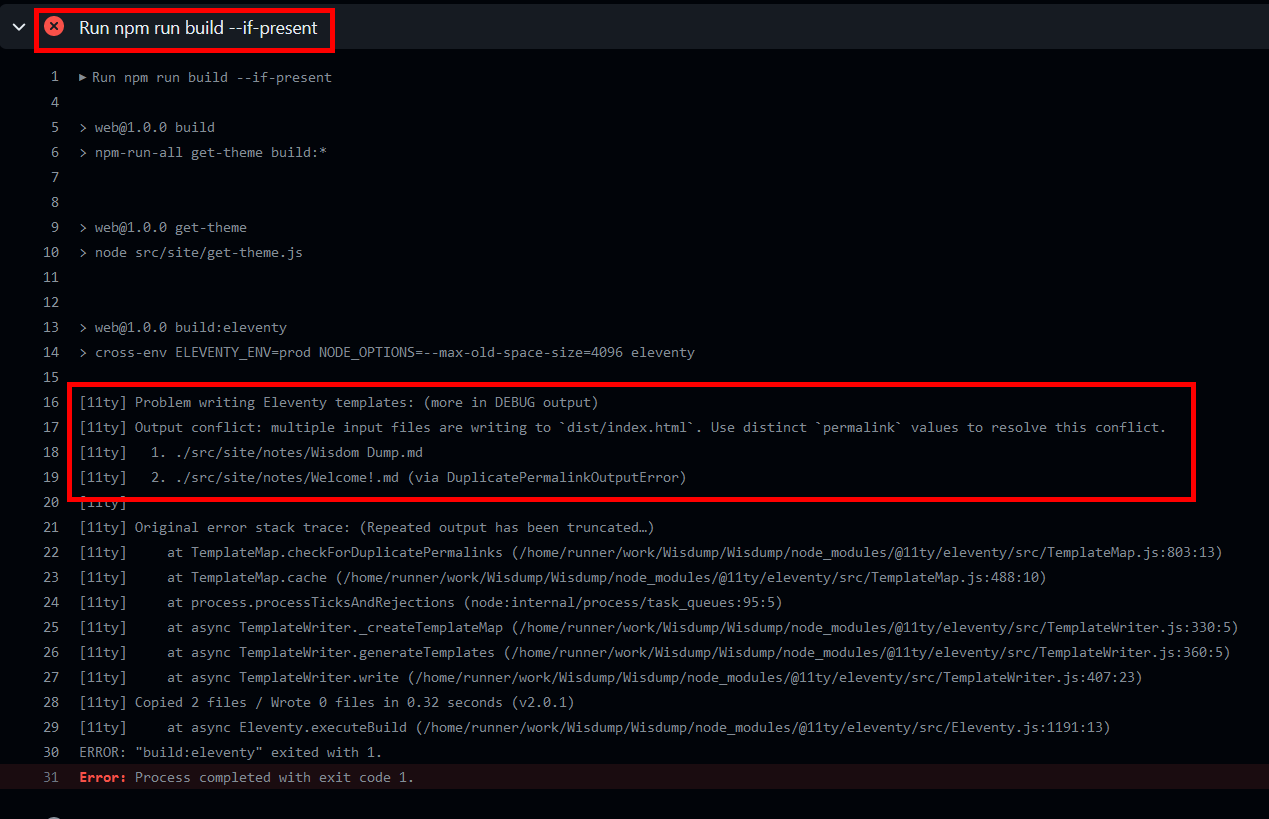 If you’re getting an 11ty error during the build, you may have 2 or more files with dg-home set to true or pages with duplicate names/links.