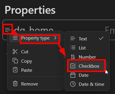 dg-homeordg-publish - Select the icon to the left of the name, and change the “Property Type” to Checkbox