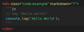 <div> codeblocks are generally less optimal, but are included here for completeness. The first line should read <div class="code-example" markdown="1">, and the last line closes the tag with </div>